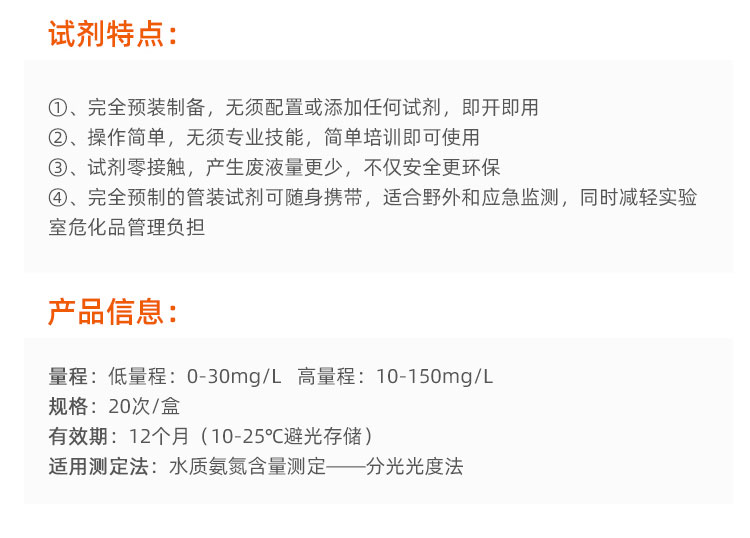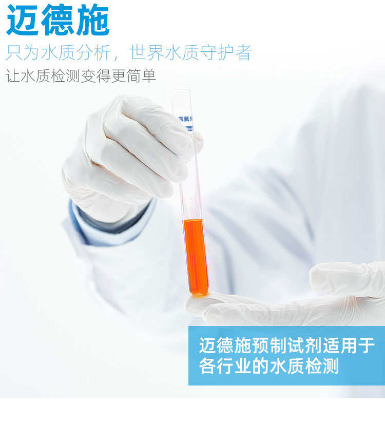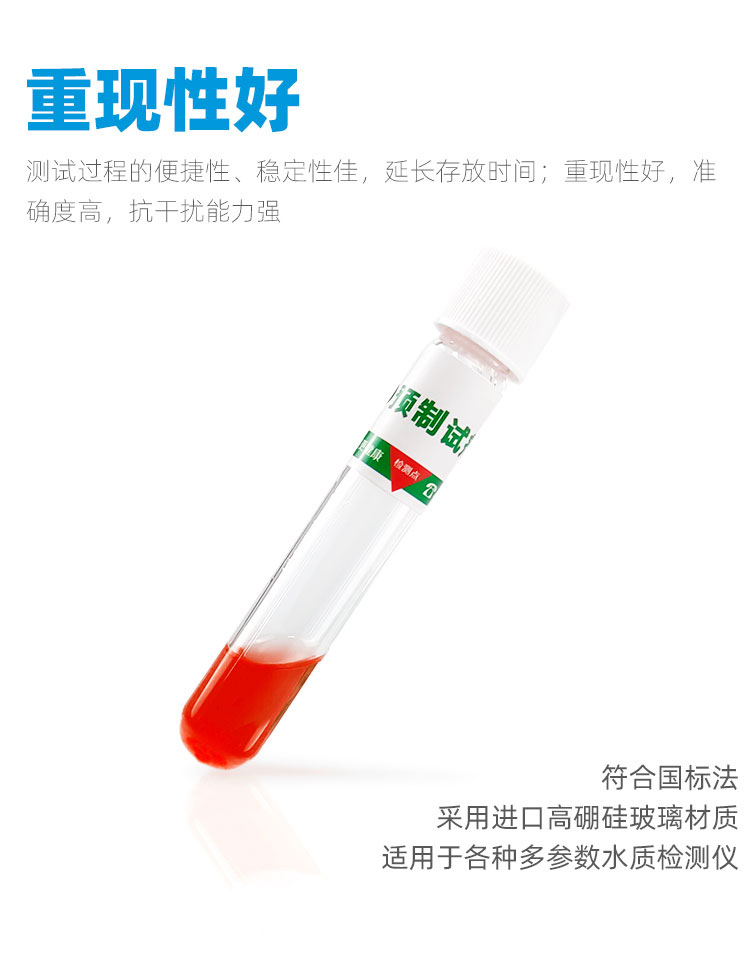 测试过程的便捷性、稳定性佳,延长存放时间;重现性好,准确度高,抗干扰能力强,采用进口高硼硅玻璃材质适用于各种多参数水质检测仪,作为绿色试剂,减少接触化学危险品的机会,确保操作人员的身体健康