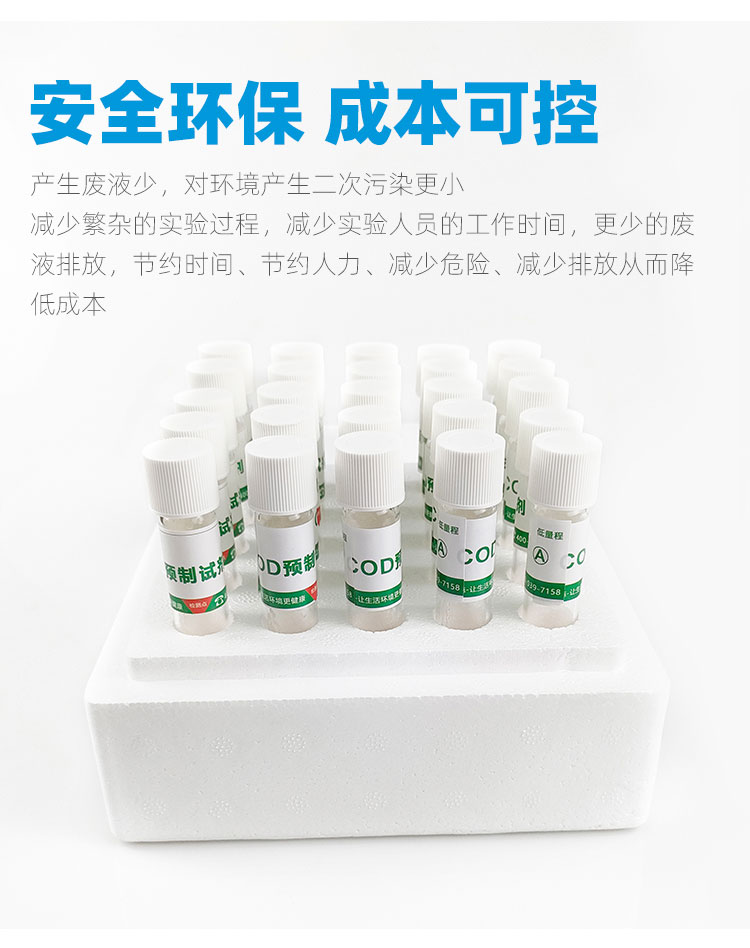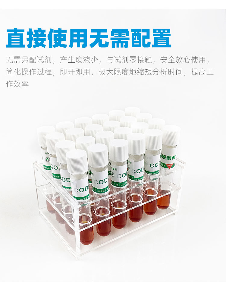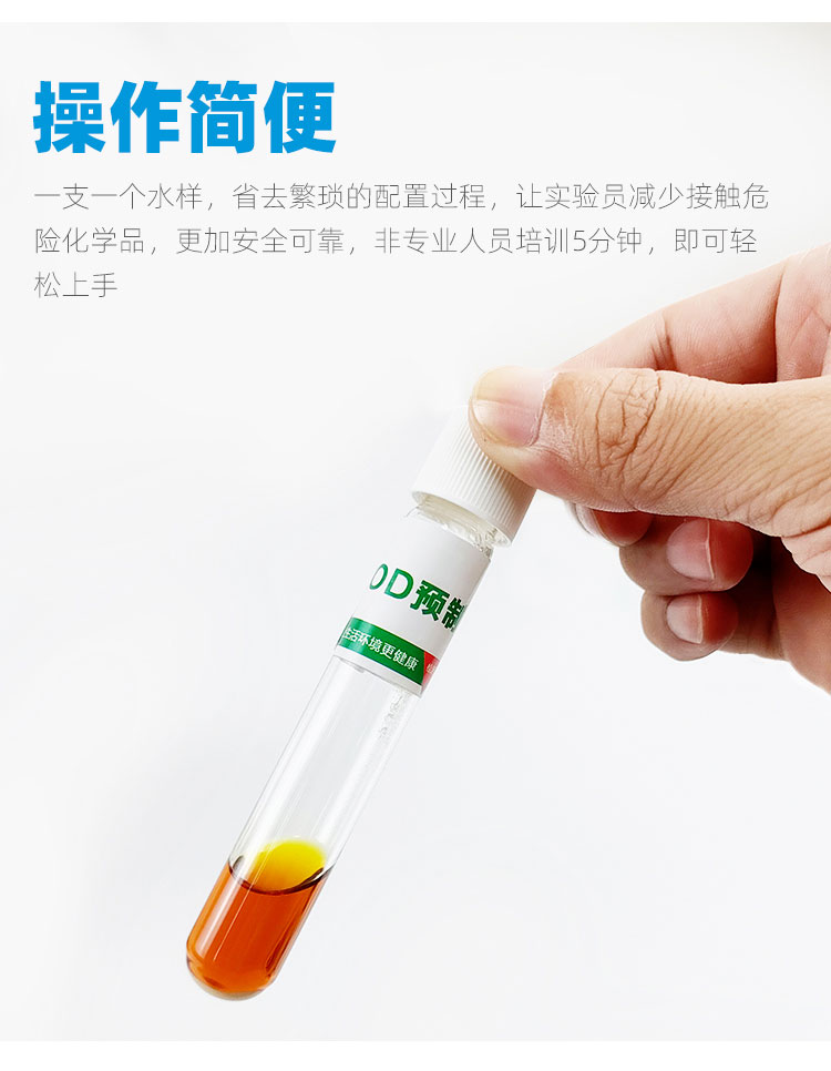一支一个水样,省去繁琐的配置过程,让实验员减少接触危险化学品,更加安全可靠,非专业人员培训5分钟,即可轻松上手
