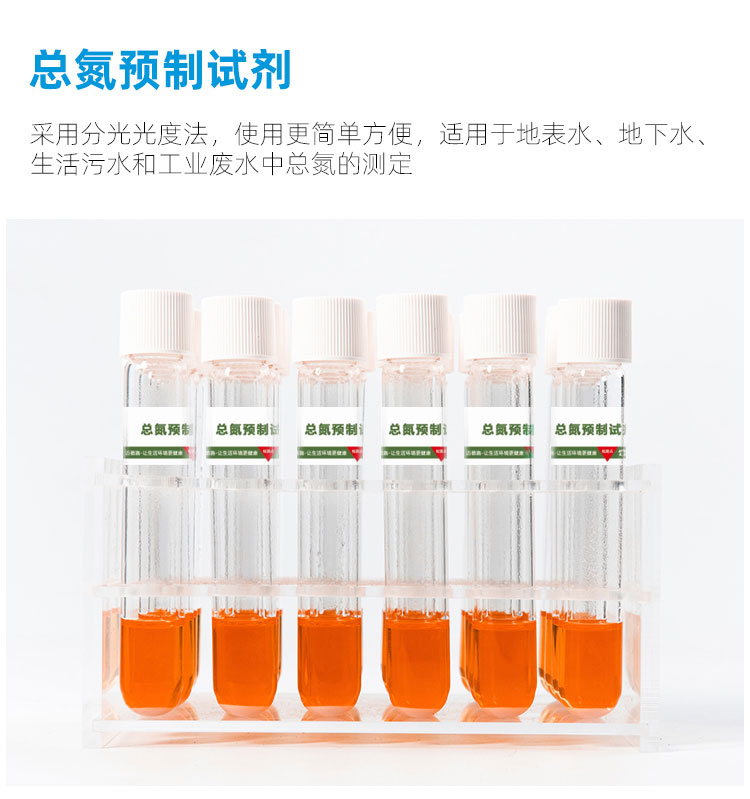 总氮测定试剂分析过程中只需将规定量的水样注入试剂或将试剂溶解在规定量的水样中,按程序操作后,将样品瓶放入分光光度计或比色计中(预存有标准曲线)直接读数便可得到精…