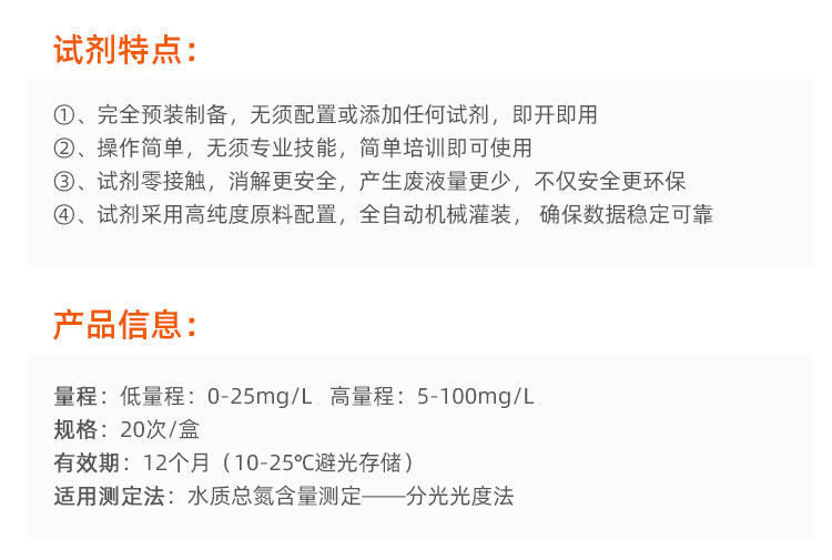 测试过程的便捷性、稳定性佳,延长存放时间;重现性好,准确度高,抗干扰能力强,采用进口高硼硅玻璃材质适用于各种多参数水质检测仪,作为绿色试剂,减少接触化学危险品的机会,确保操作人员的身体健康