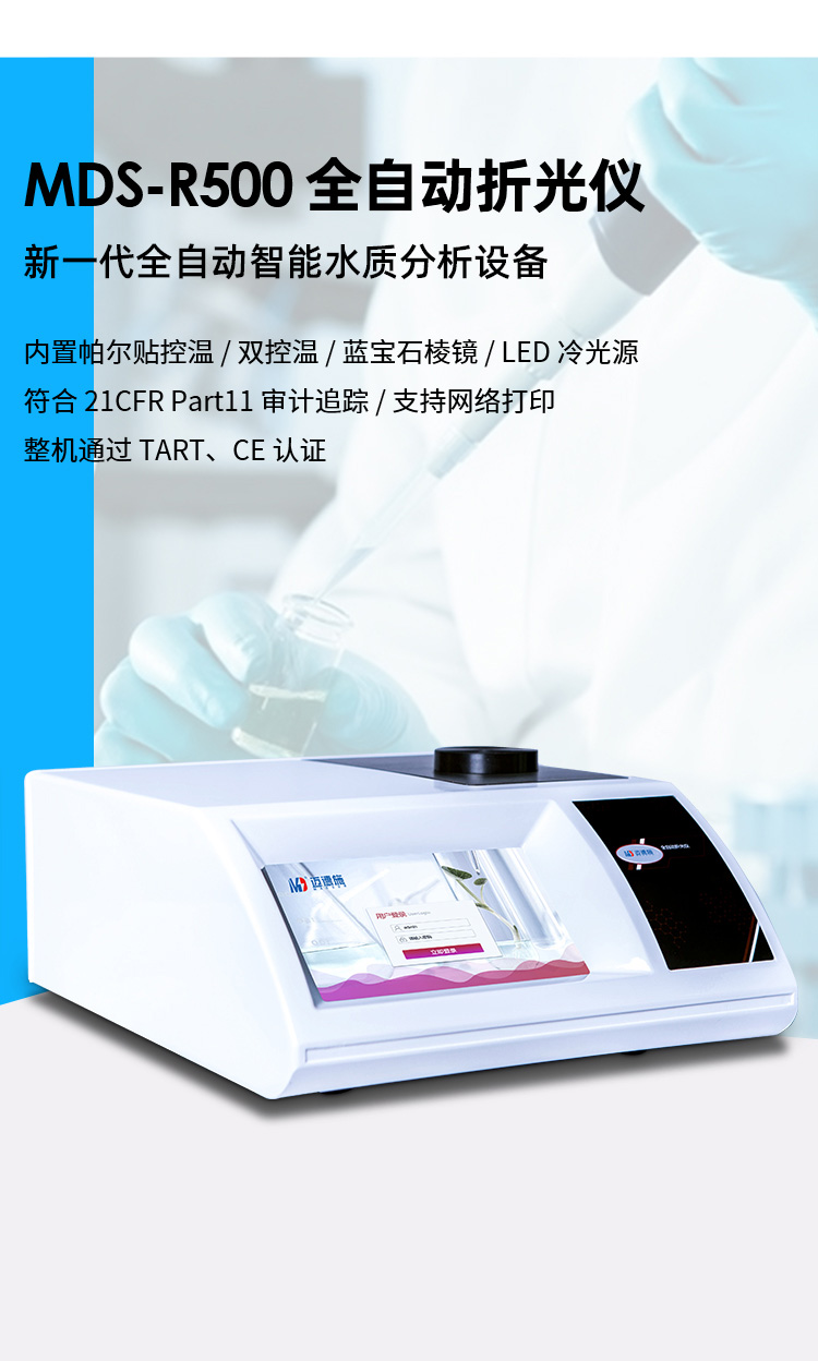 MDS-R500全自动折光仪是迈德施生产制造的一种主要用于测量物质折射率的专业实验室仪器仪表。全自动折射仪配备高性能线阵 CCD 感光部件,通过高速、高精度的信号采集和分析处理技术,配有半导体帕尔贴超级温度控制系统。能高效、高精确测量透明、半透明、深色、粘稠状等各类液体的折射率(nD)和糖溶液的质量分数(锤度 Brix)。